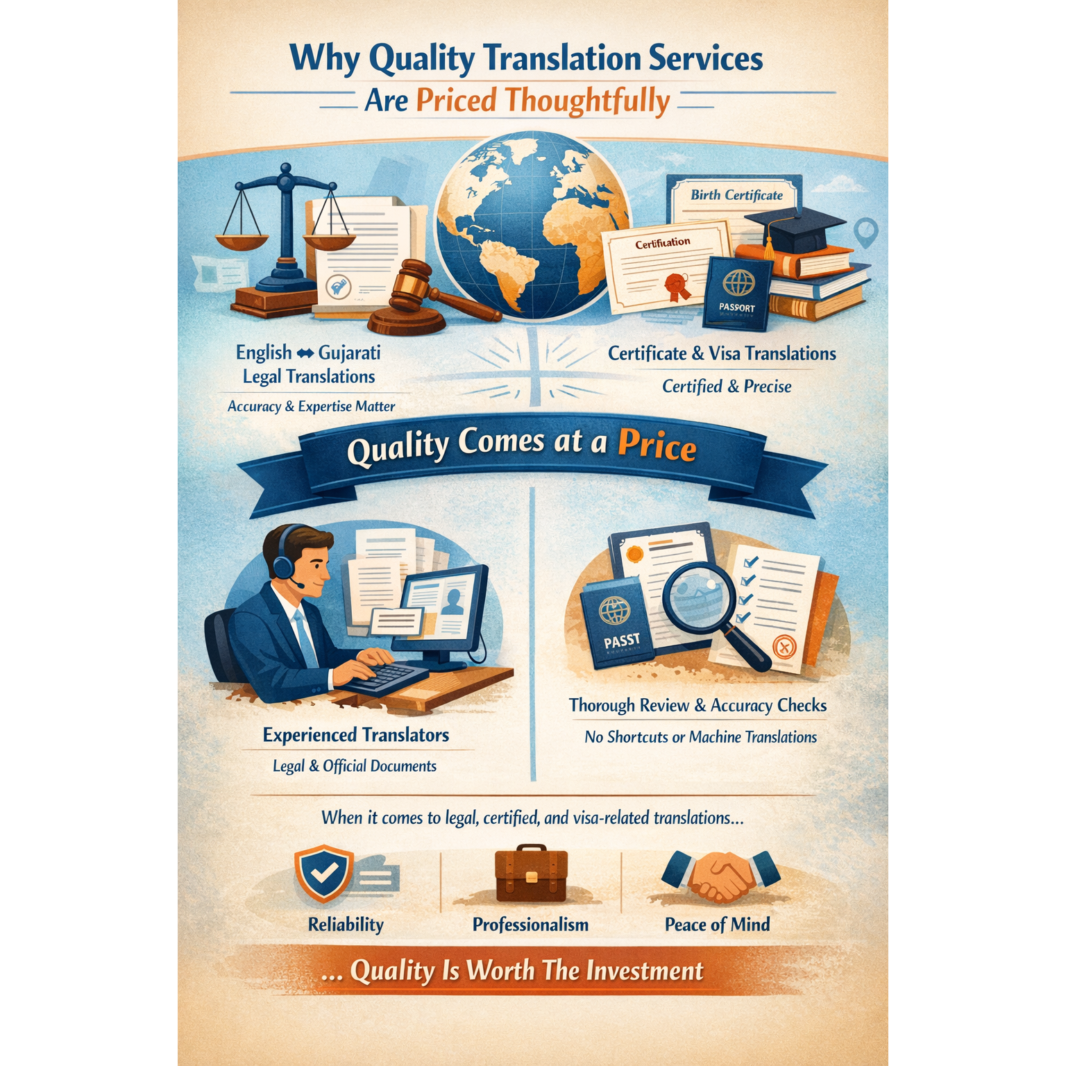 At our translation agency, we are often asked why professional translation—especially for legal, certificate, and visa-related documents—may appear slightly higher in cost compared to generic or automated services. We believe it is important to explain this transparently to our valued clients. Legal translations between English and Gujarati demand far more than bilingual ability. They require a deep understanding of legal terminology, statutory language, formatting conventions, and the legal intent behind every word. A minor error, mistranslation, or omission in a legal document, affidavit, contract, or court paper can lead to delays, rejections, or even legal complications. Precision is not optional—it is essential. Similarly, certificate translations (birth, marriage, education, death, caste, and other official records) and visa or immigration documents must strictly comply with the requirements of embassies, courts, government authorities, and foreign institutions. These translations often need consistency, formal tone, accuracy in names and dates, and in many cases, certification and accountability. Our translations are carefully reviewed to ensure they meet these exacting standards. Our pricing reflects the expertise, time, and responsibility involved. Every document is handled by experienced translators who specialize in legal and official translations, followed by quality checks to ensure accuracy and clarity. We do not rely on automated tools or shortcuts where the stakes are high. We understand that cost matters, and we strive to keep our services fair and competitive. At the same time, we firmly believe that when it comes to legal, certified, and visa-related translations, quality, reliability, and peace of mind are worth the investment. We sincerely thank our clients for their trust and continued support, and we remain committed to delivering translations that are accurate, dependable, and professionally sound. You can depend on Umang Translations.